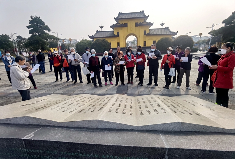 美哉师大,气象万千。在东莼桥头,老同志们朗诵起《广西师范大学颂》。在这道靓丽的新地标前,《广西师范大学颂》的作者张葆全老校长为大家就全文内容作了现场讲解,倾情抒发了对师大的赞美,阐释了师大精神气韵。老同志们再一次深刻领略了师大文化的真正内涵。