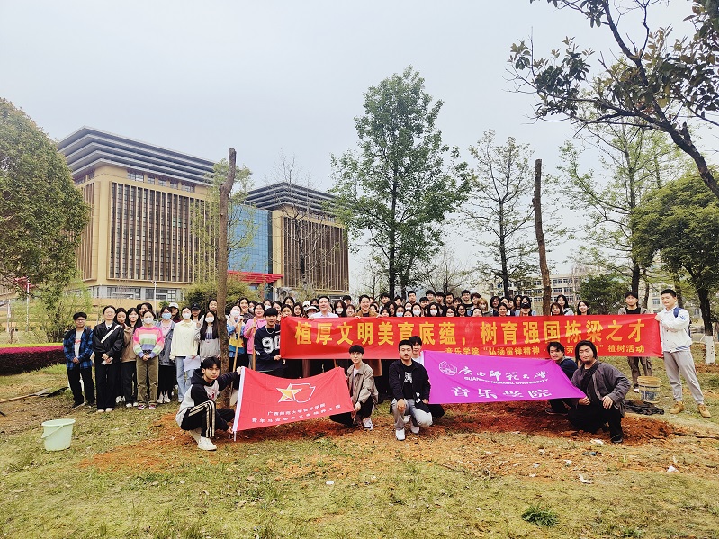 习近平总书记指出:“造林绿化是功在当代、利在千秋的事业,要一年接着一年干,一代接着一代干,撸起袖子加油干。”自2018年起,学院每年定期开展植树活动,一年组织师生种植两到三棵树,师大“音乐林”初见雏形、茁壮成长。