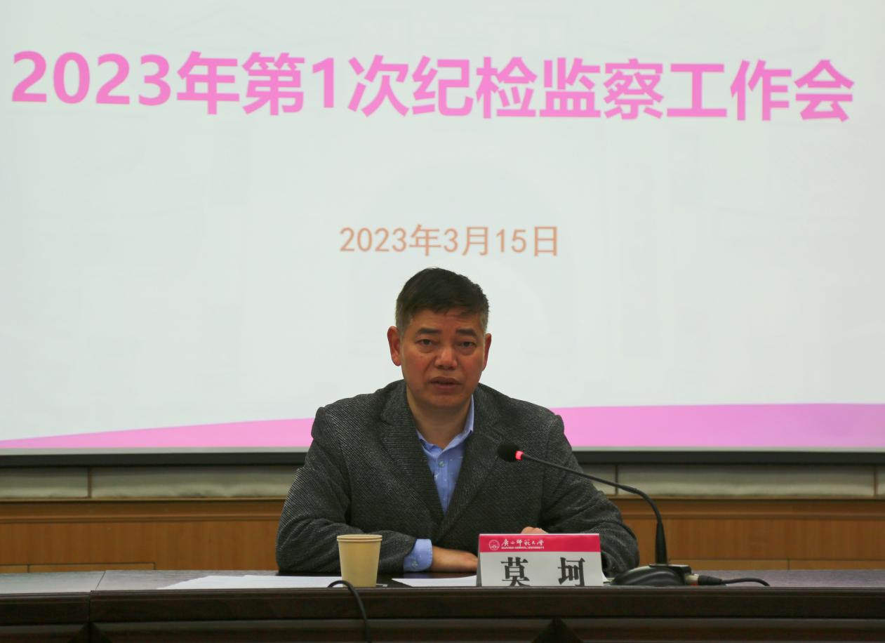 3月15日,2023年第1次纪检监察工作会在育才校区图书馆报告厅召开,校党委常委、驻校纪检监察组组长莫坷出席会议并作讲话。学校党风廉政建设办公室/党委巡察工作办公室相关负责人、各基层单位纪委书记和党总支纪检委员,以及驻校纪检监察组全体干部参加了会议。会议由驻校纪检监察组副组长韦冬主持。
