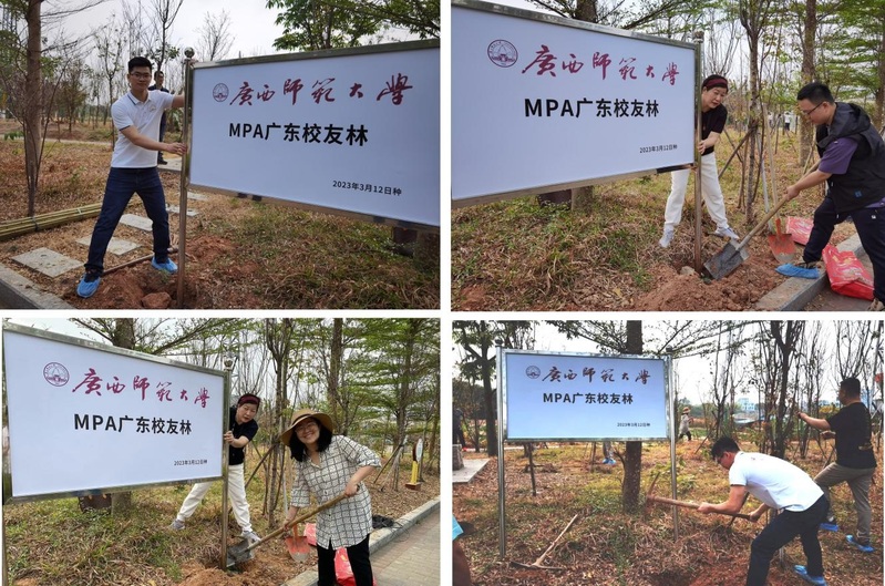 上午9时许,近在东莞,远至韶关、佛山等地的校友们都陆续到场。在苗木专家的指导下,大家三五成群协作植树。经过大家近一小时的不懈努力,一枝枝树苗已扎根大地,蔚然成林。其后,校友们你一铲我一锹浇筑混凝土,在刚刚种下苗木旁竖立起“广西师范大学MPA广东校友林”匾牌以作见证。