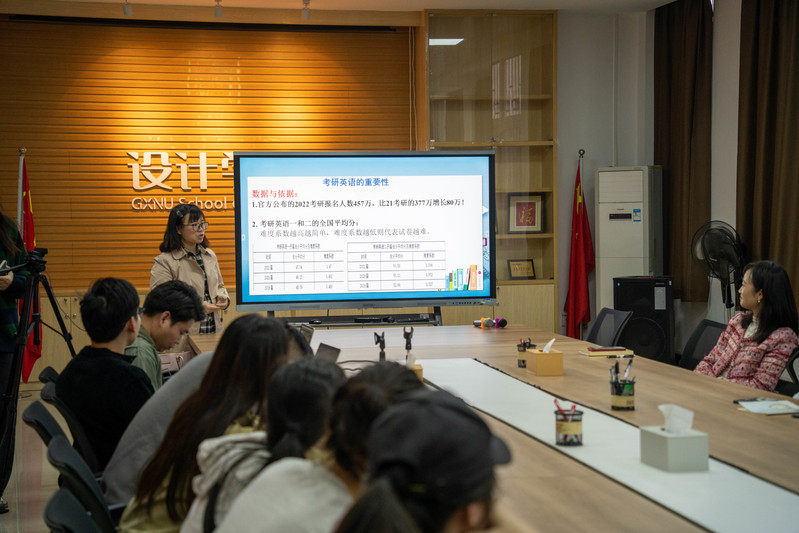 为全力做好学生考研指导和服务工作,多渠道、多层次开展考研助力活动,3月15日,设计学院开展2023年春季学期第一期“乐之者”师生月月谈。此次月月谈特邀外国语学院副教授、英语教学论方向硕士生导师甘玲玲,为设计学院大三年级学生带来主题为“筑梦未来 护航考研”的专题讲座。学院党委相关负责人、全体专兼职辅导员、本科生学生代表通过“线上+线下”的方式参加会议。