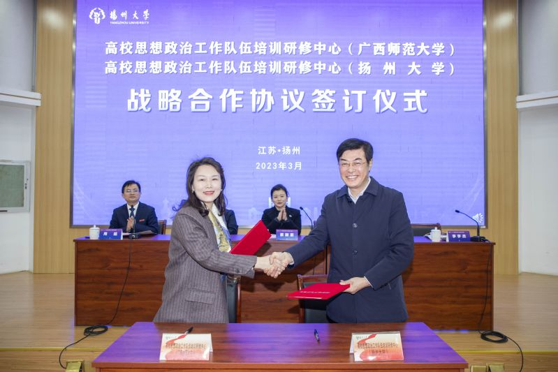 随后,举行了教育部高校思想政治工作队伍培训研修中心(广西师范大学)(扬州大学)战略合作协议签订仪式。