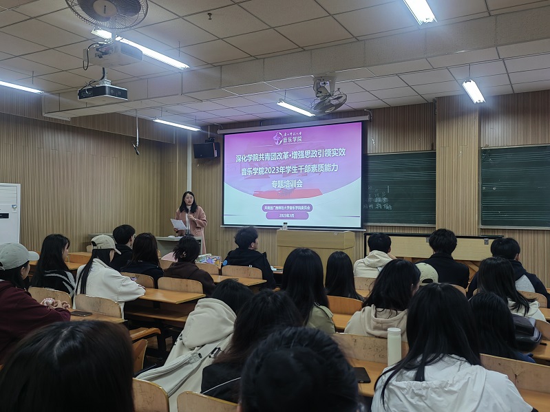 音乐学院团委指导老师以《深化学院共青团改革·增强思政引领实效》为题,对学院2023年学生干部进行素质能力专题培训。她强调担任学生干部要把政治标准放在首位,学生干部要加强学习,不断提升个人的思想觉悟和政治意识,要把树立远大志向与选择正确成长路径结合起来,切实提高履行职责的能力和水平。