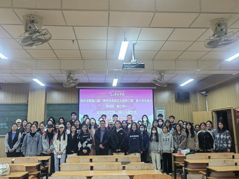 为深入学习宣传贯彻党的二十大精神,进一步加强对青年大学生的思想政治引领,深化党建带团建工作机制,3月21日,音乐学院第八期“青年马克思主义培养工程”暨大学生骨干培训班(第三讲)如期举行,音乐学院党委负责人作为主讲嘉宾,以“立志做有理想、敢担当、能吃苦、肯奋斗的新时代好青年”为主题进行专题党课。