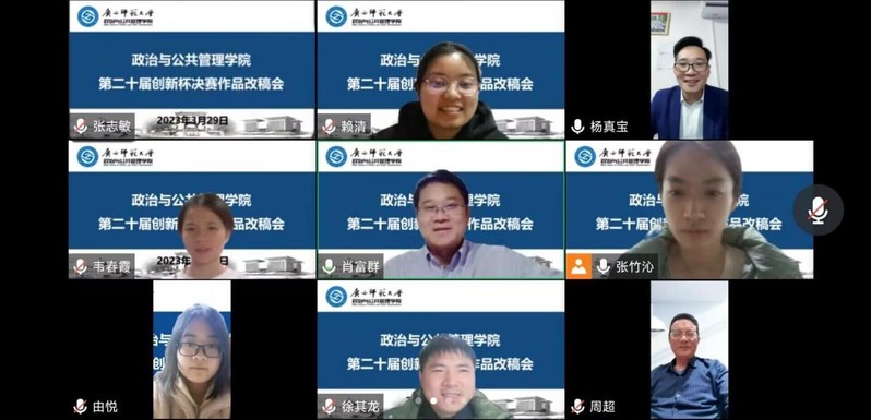 为进一步营造学术研究氛围,促进学院创新创业工作发展,政治与公共管理学院于3月29日晚召开第二十届“创新杯”大学生课外学术科技作品竞赛决赛作品线上改稿会。学院行政主要负责人、党委相关负责人、行政相关负责人、社会学与社工系主部分教师、团委书记、各年级辅导员以及各团队成员参加本次会议。会议由学院团委相关负责人主持。
