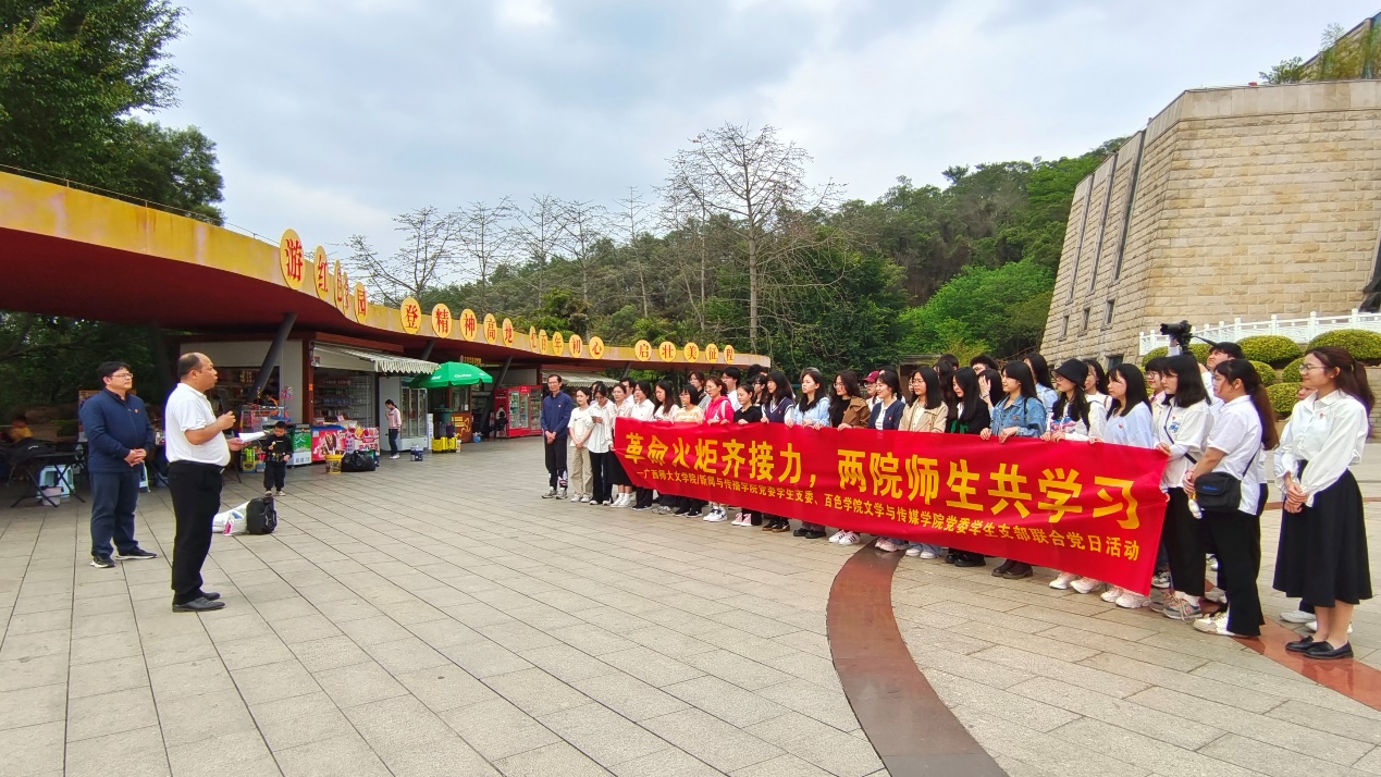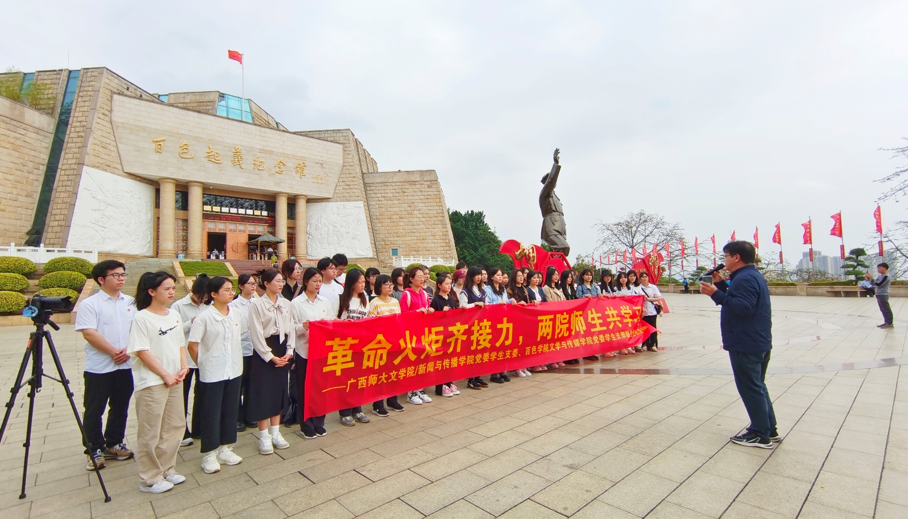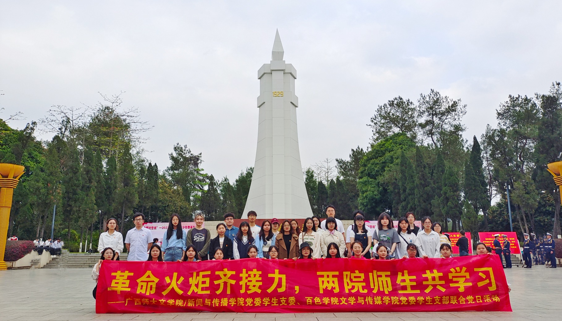 为全面深入党史学习教育,学习红色文化,传承红色基因。4月1日,文学院/新闻与传播学院党委学生支委赴广西革命圣地百色,与百色学院文学与传媒学院党委学生支部联合开展以“革命火炬齐接力,两院师生共学习”为主题的联合党日活动。