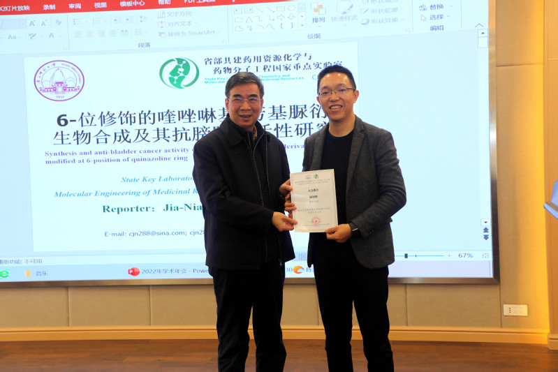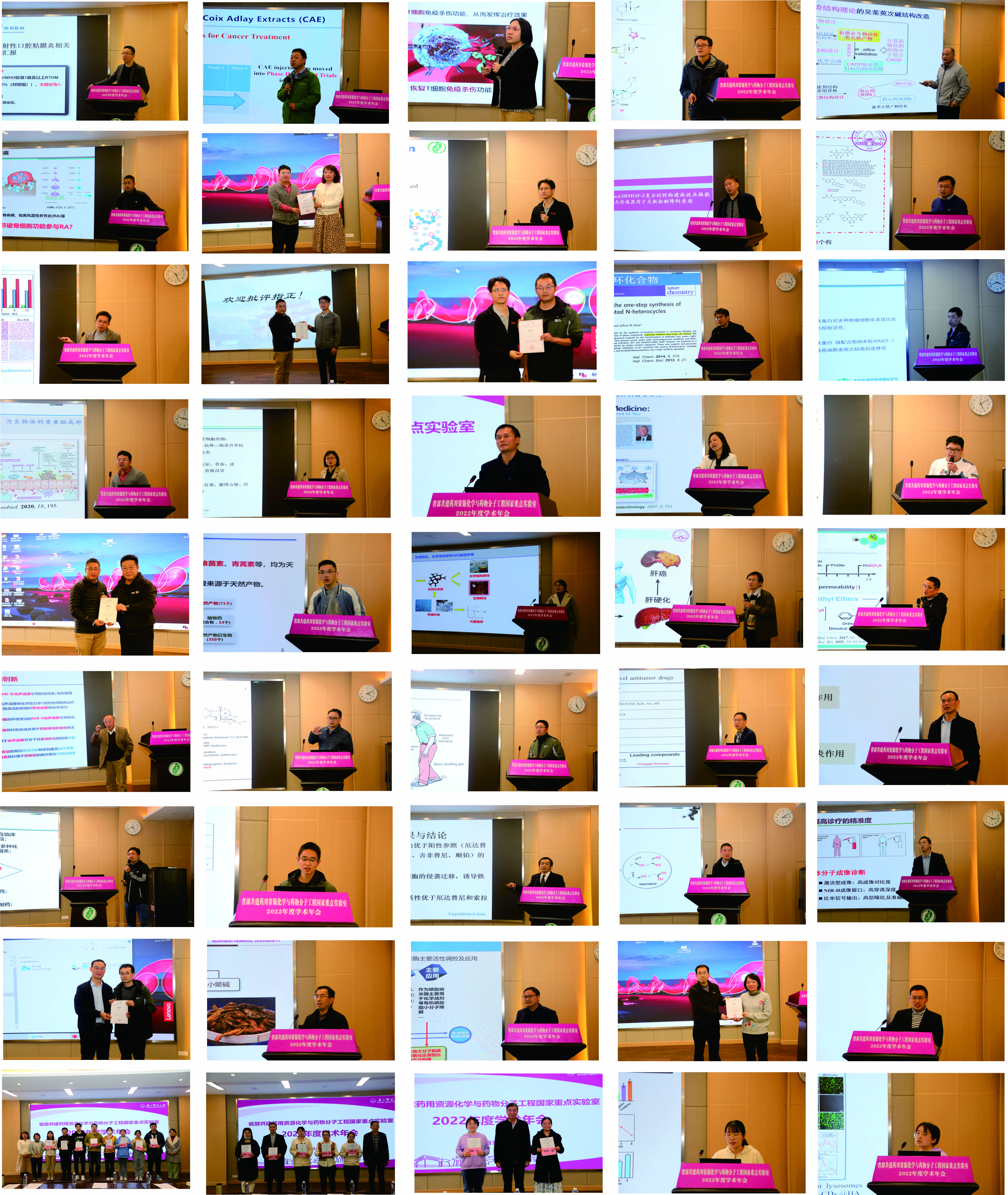 在学术报告环节,共有3位校外专家和40位实验室研究人员做了学术报告,校外的专家主要介绍无机创新药物研制、中药治疗肿瘤研究,分享了在新药研制和中药创新理论探究的经验,在40位研究人员的报告中,大家紧扣重点实验室研究方向,着重介绍本课题组一年来的研究进展和取得的最新成果,分享了在广西民族药活性物质基础研究、药物先导化合物合成及活性研究、疾病诊疗新材料新方法研究、药物体内过程机制研究以及成果应用转化等方面的进展和经验,从展示的成果看,在重点实验室倡导的既要开展基础创新研究、推动前沿科学研究,又要针对社会需求,加快科技成果转化,服务地方产业的理念引领下,经过两年的实施,已经取得明显成效,此次报告中展示有聚焦药学前沿研究的有相当影响力的高水平论文,也有极具开发价值和市场潜力的应用成果。每个学术报告简短精练,浓墨重彩,令人耳目一新。