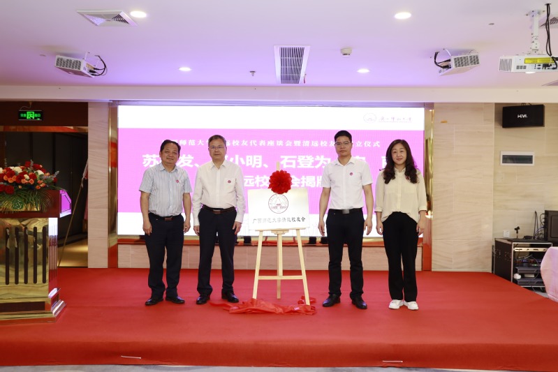 苏桂发(左二)、何小明(左一)、石登为(右二)、安丽(右一)为清远校友会揭牌