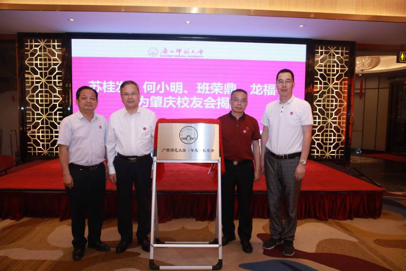 苏桂发(左二)、何小明(左一)、班荣鼎(右二)、龙福宇(右一)为肇庆校友会揭牌