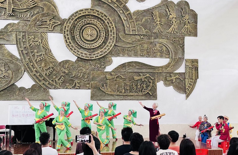 春暖花开时,又逢三月三。4月18日,在八桂人民喜迎“三月三”传统节日之际,音乐学院邀请桂林渔鼓传承人彭承红、“天天唱”渔鼓基地队员到雁山校区音乐楼进行桂林山歌现场教学,将缤纷多彩的民族文化引进课堂、融入生活,在丰富学生校园生活的同时,促进非遗文化代代相传。