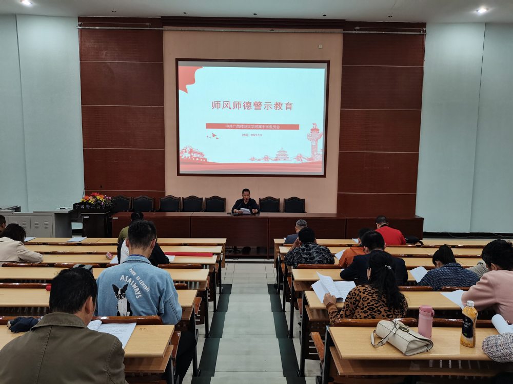 附属中学相关负责人从师风师德进行警示教育。他在会上集中学习了教育部公开曝光第十二批7起违反教师职业行为十项准则典型案例和自治区纪委监委通报5起享乐奢靡典型案例,以此进行警示教育。他警示全体党员要以案明纪,以身作则,不触碰政治红线,牢牢守住政治底线。