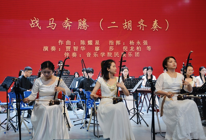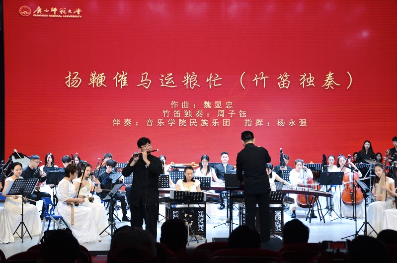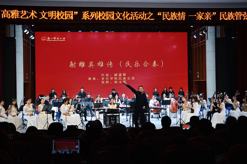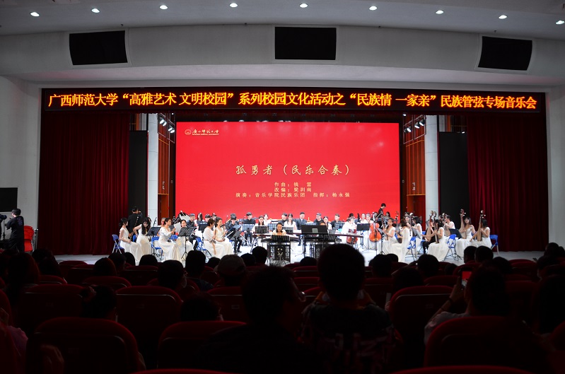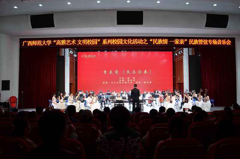 近日,广西师范大学“高雅艺术 文明校园”系列校园文化活动之“民族情 一家亲”民族管弦专场音乐会在雁山校区音乐楼成功举行。二胡、古筝、琵琶、唢呐等传统民族乐器相继登场、倾情献演,让观众们近距离感受到了民族管弦乐的魅力。全校400余名师生观众观看演出,现场气氛热烈、座无虚席。