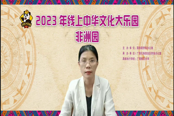 5月15日,由国务院侨务办公室主办,广西壮族自治区侨务办公室承办,广西师范大学具体执行的2023年中华文化大乐园—非洲园正式开园,来自埃及、津巴布韦、卢旺达、赞比亚、刚果(布)、尼日利亚、利比里亚、黎巴嫩、土耳其、越南等国家的近300名学生以线上的形式参加了开园仪式。