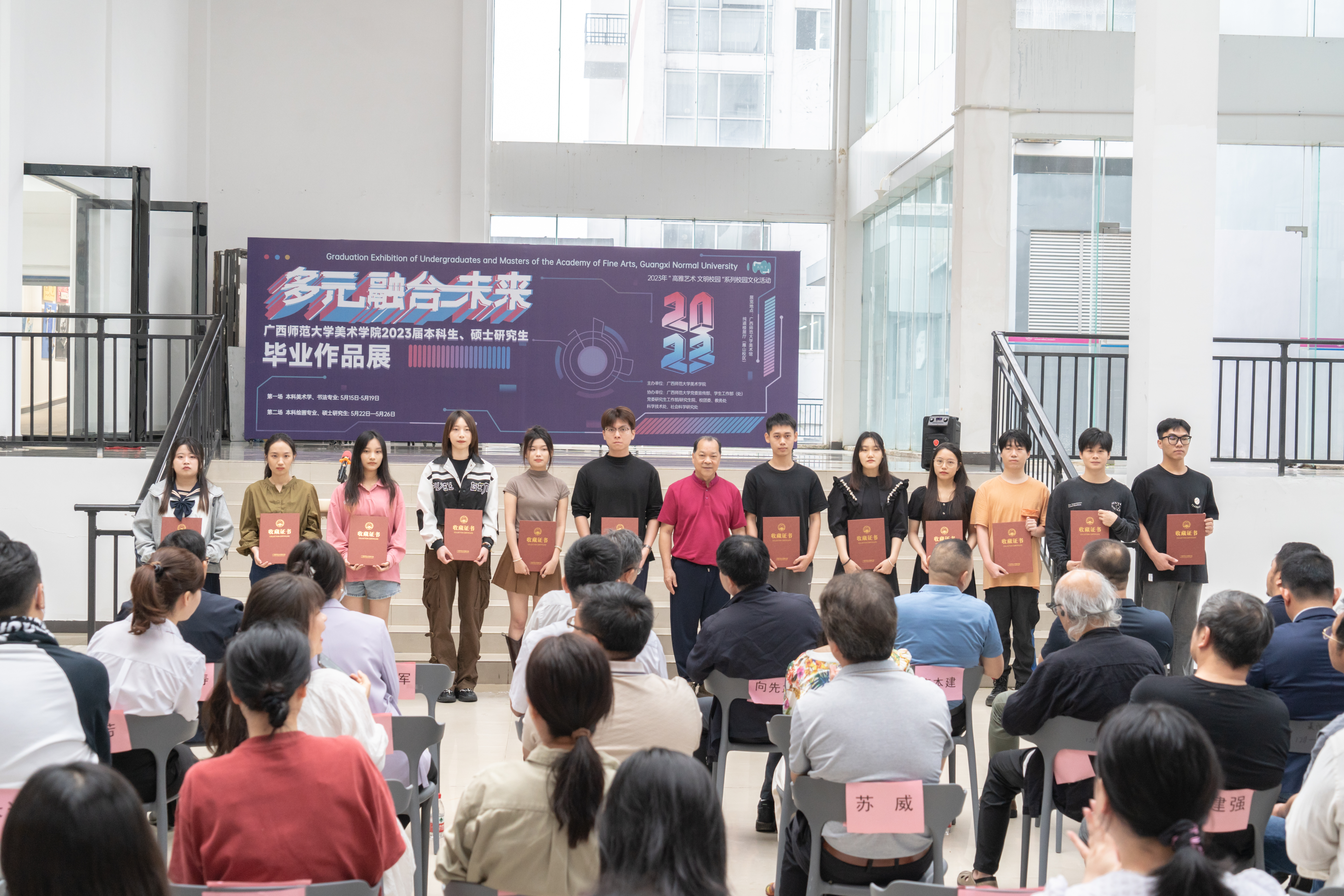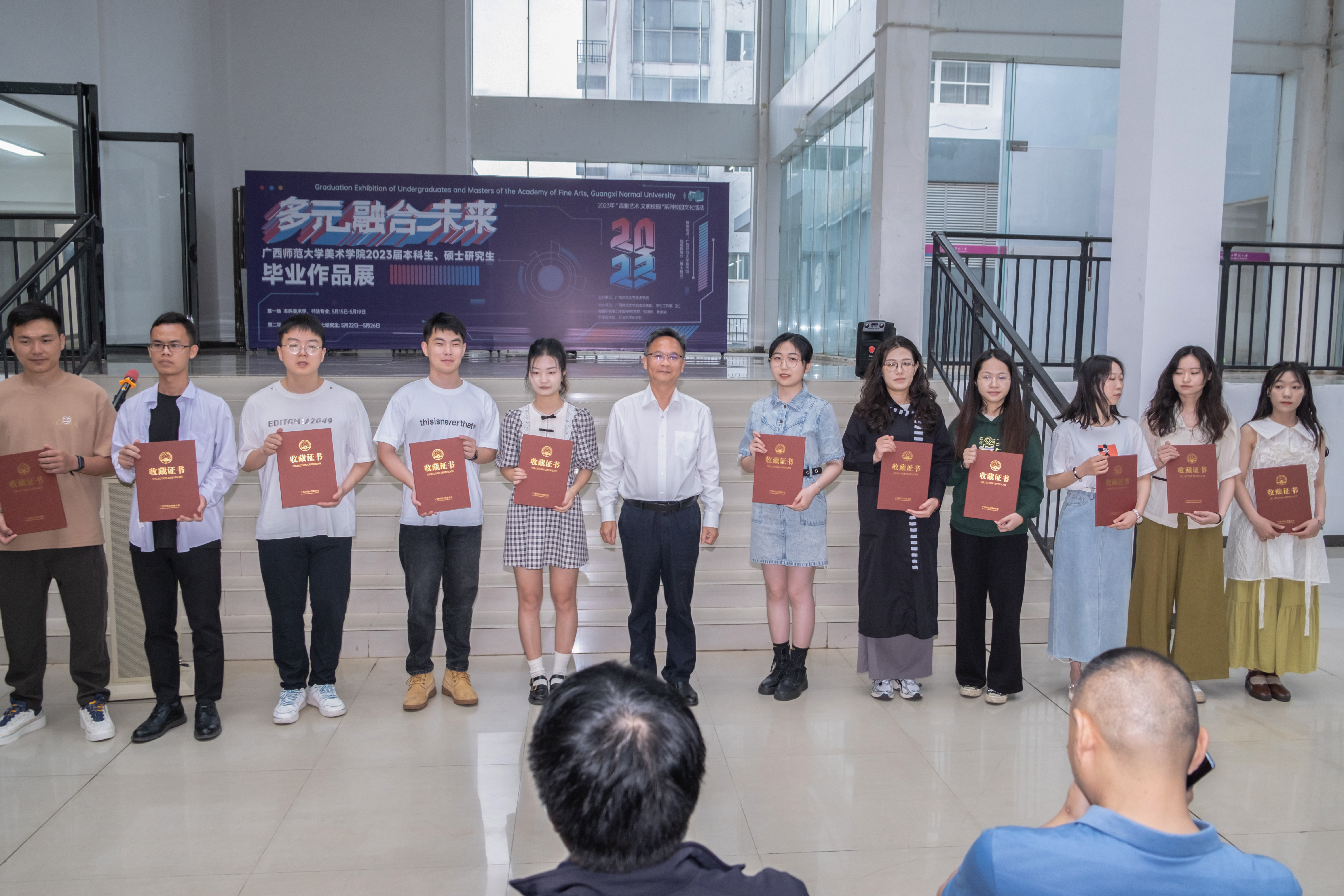 林春逸和白晓军为本科生、研究生优秀作品创作者一一颁发收藏证书。全体与会人员在开幕式后参观了展览。
