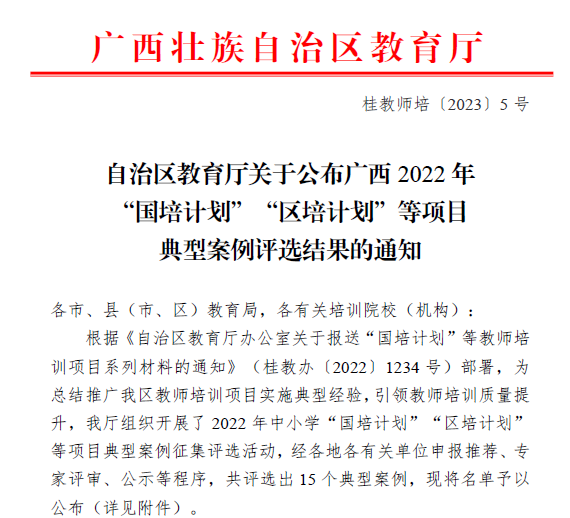 近日,广西壮族自治区教育厅公布了广西2022年 “国培计划”“区培计划” 等项目典型案例评选结果。职业技术师范学院报送的教师培训工作案例《构建“德能双修 知行并重 五性融通”培训模式赋能中等职业学校幼儿保育专业骨干教师发展》从全区各地市申报的工作案例中脱颖而出,获得广西2022年职业院校教师培训项目典型案例。