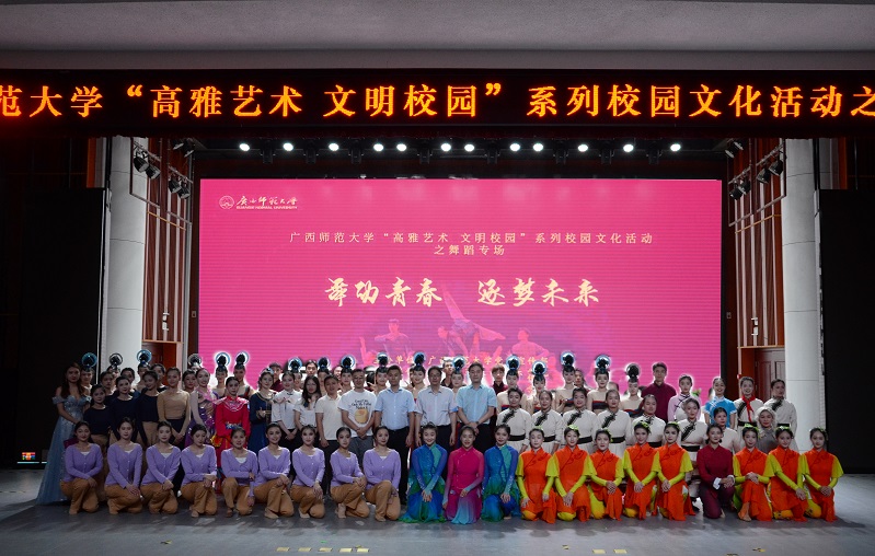 为丰富校园文化生活,提高学生艺术修养,为学校师生搭建近距离接触艺术、亲近艺术、感受艺术的平台,近日,广西师范大学“高雅艺术 文明校园”系列校园文化活动之“舞动青春 逐梦未来”舞蹈专场在雁山校区音乐楼成功举行。