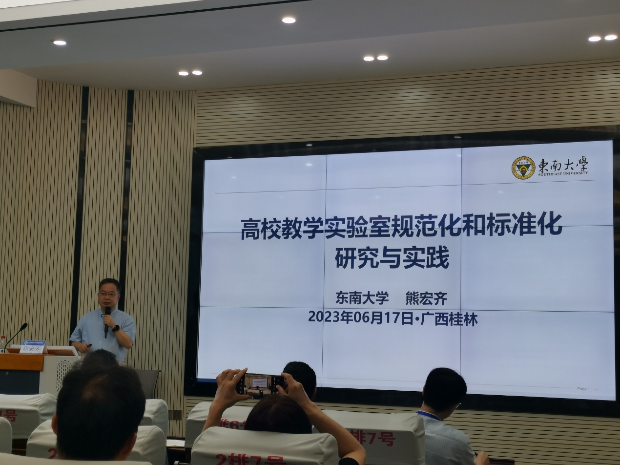 讲座中,熊宏齐教授结合东南大学实验室建设管理模式与实验教学改革探索实践,就虚拟仿真实验教学项目建设规范、专业实验教学体系化标准化重构、虚实融合的专业在线实验室建设、教学科研技术兼容实验队伍建设和实验室安全治理体系建设与创新等五个方面分享了他在实验室建设和实验教学方面的经验和前瞻思考。