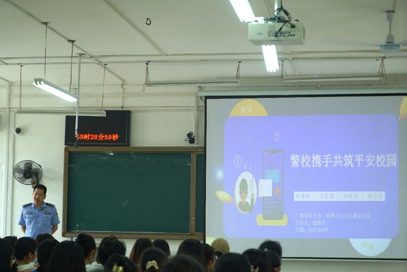 为进一步提高广大师生防范网络电信诈骗鉴别能力和防范意识,合力构建“无诈校园”,筑牢校园网络安全防线,近期,我校学生工作部(处)、党委研究生工作部、保卫处邀请桂林市公安局雁山分局的赵俍杰警官走进课堂,在我校开展了“防范电信网络诈骗,警校携手共筑平安校园”主题微课堂活动,助力保障师生财产安全,携手共筑平安校园。来自文学院/新闻与传播学院学子150名学生参与。