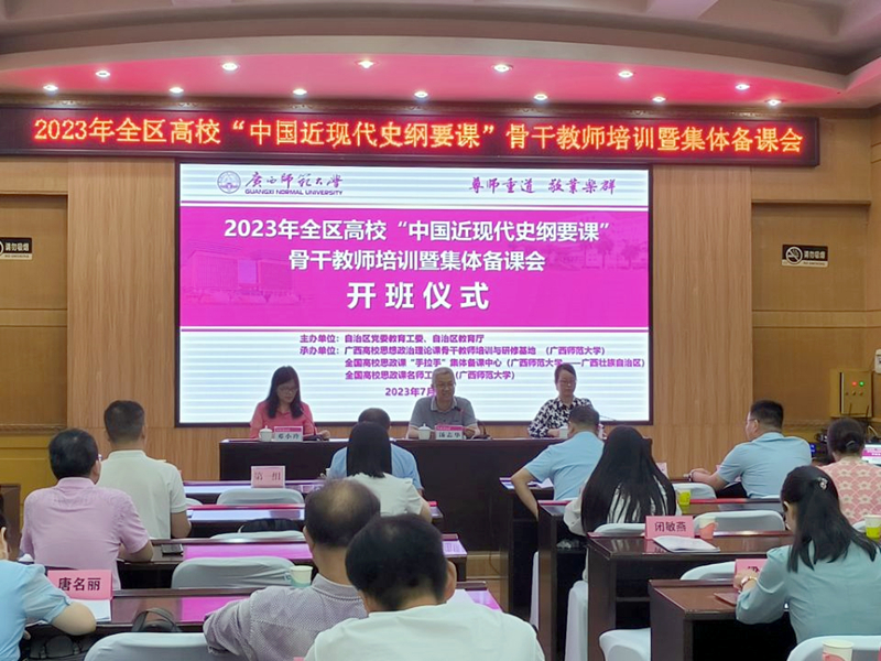为深入贯彻落实习近平总书记在学校思想政治理论课教师座谈会上的重要讲话精神,提高新时代学校思想政治理论课的实效性,由自治区教育厅主办,广西高校思想政治理论课课骨干教师培训与研修基地(广西师范大学)、全国高校思政课教师“手拉手”集体备课中心(广西壮族自治区)、全国高校思政课教师名师工作室(广西师范大学)承办的“中国近现代史纲要课”骨干教师培训暨集体备课会在我校开班,来自全区39所本科高校近70名骨干教师参加了培训会。