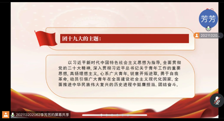 7月31日,职业技术师范学院2022年青马班全体学员通过腾讯会议召开了“青春心向党 奋进新时代”团十九大精神学习会。会议主要围绕中国共产主义青年团第十九次全国代表大会概况、团十九大报告的主要内容以及团章修改情况等大会精神进行学习。
