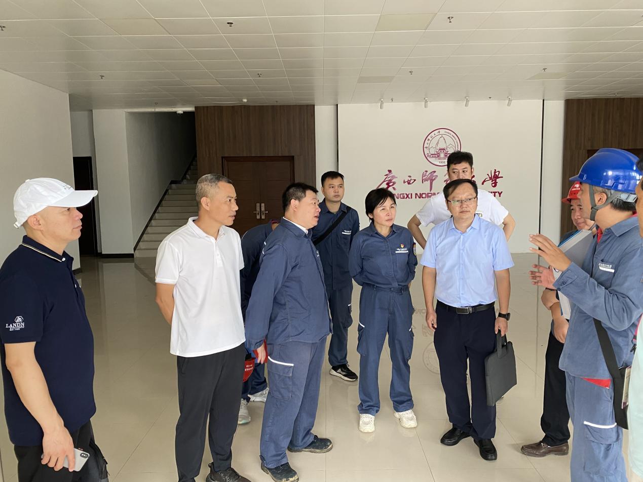 9月21日,为进一步加强场馆用电安全,切实消除各类用电安全隐患,提升应急处置能力,确保各个场馆安全运行。自治区教育厅体卫艺处副处长卫涛带领一行到我校雁山校区综合体育馆,针对第一届全国学生(青年)运动会健美操(啦啦操)项目比赛场馆用电安全保障工作开展专项检查,体育与健康学院、后勤集团、基建处、相关负责人陪同。