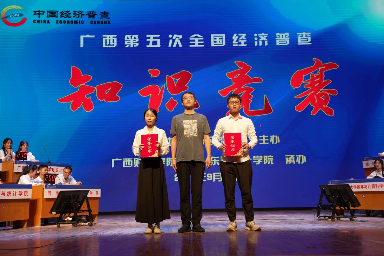 近日,由广西壮族自治区统计局主办,广西财经学院中国—东盟统计学院承办的广西“第五次全国经济普查”知识竞赛在广西财经学院举行。广西师范大学数学与统计学院唐晓蕾、黄月林、周心雯参加比赛,并荣获广西“第五次全国经济普查”知识竞赛二等奖。