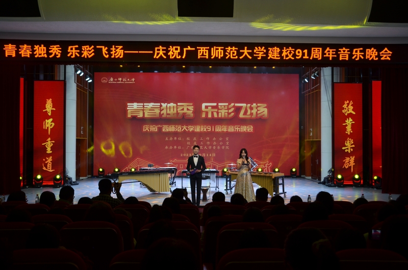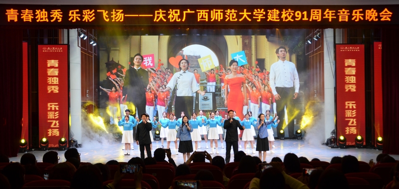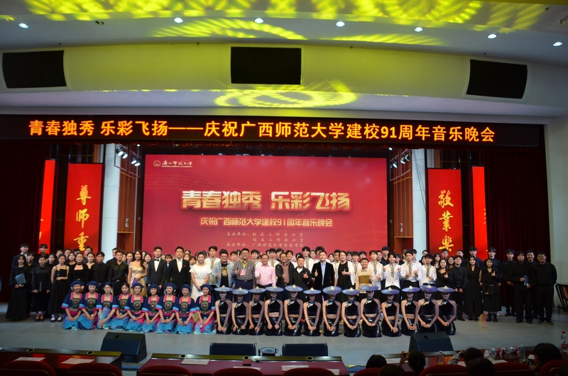为庆祝学校建校91周年,进一步推进校园文化建设,助力学校国内一流大学建设,营造“爱校、荣校、强校”的良好氛围,10月14日晚,青春独秀,乐彩飞扬——庆祝广西师范大学建校91周年音乐晚会在音乐学院三楼综合厅隆重举办。校庆工作办公室相关负责人、校长办公室相关负责人、校友代表、音乐学院党政班子和专兼职辅导员、全校500名师生共同观看了本场演出。