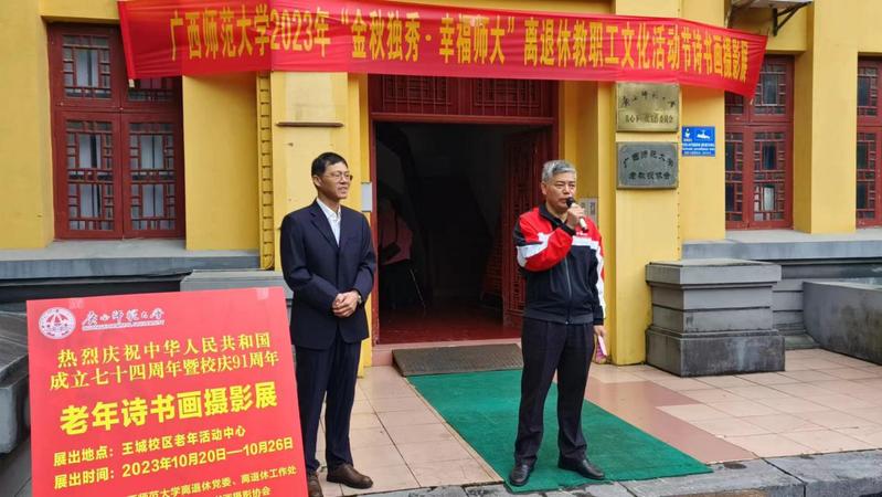 为丰富学校离退休教职工文体生活,进一步激发老同志爱党爱国和荣校情怀,欢度即将到来的九九重阳“敬老节”,根据文化活动节活动安排,10月20日,广西师范大学2023年“金秋独秀·幸福师大”离退休教职工文化活动节诗书画摄影展在王城校区离退休教职工活动中心开展。学校各二级学院(部)、各二级单位分管离退休工作负责人,离退休教职工及师生代表100多人参加了活动。学校党委副书记、自治区纪委监委驻学校纪检监察组组长莫坷出席开幕式宣布活动开幕,并在离退处主要负责人陪同下参观了展览,对离退休老同志用诗书画摄影作品表达爱党爱国和荣校情怀表示赞许,对老同志精湛才艺表示赞叹,对学校养老文化建设表示肯定。