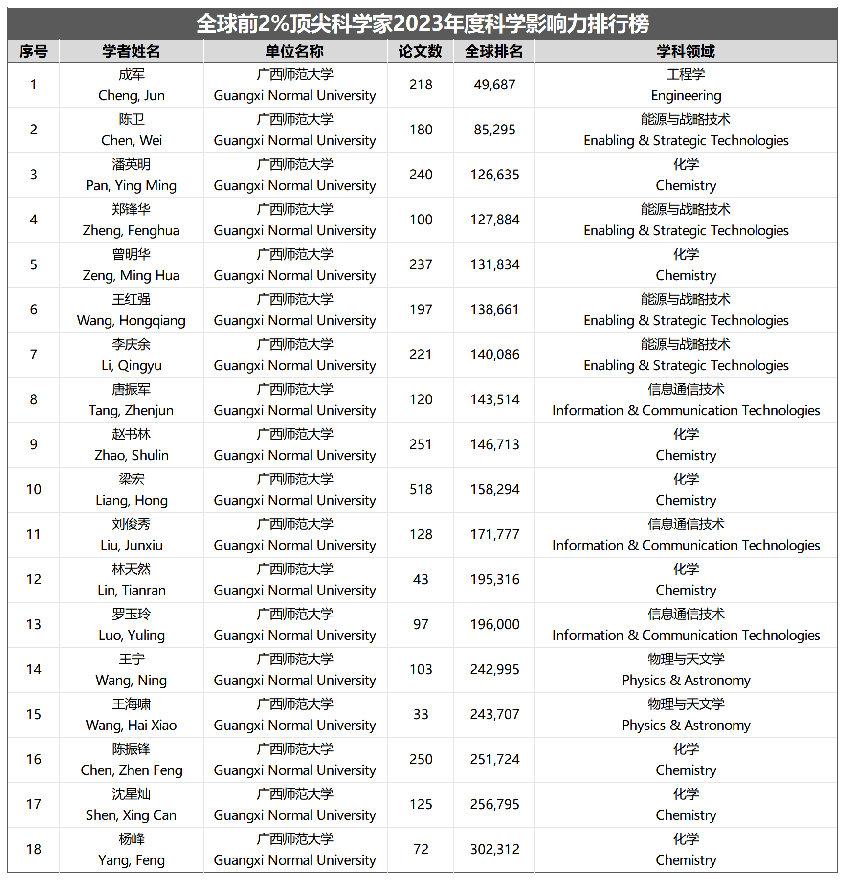 近日,美国斯坦福大学发布了2023年版全球前2%顶尖科学家榜单,我校19位学者入围榜单,其中我校赵书林、曾明华、成军3位教授入选“终身科学影响力排行榜(1960-2023)”和“2023年度科学影响力排行榜”榜单,蒋治良教授入选“终身科学影响力排行榜(1960-2023)”,陈卫、潘英明、郑锋华、王红强、李庆余、唐振军、梁宏、刘俊秀、林天然、罗玉玲、王宁、王海啸、陈振锋、沈星灿、杨峰等15名教师入选“2023年度科学影响力排行榜”。