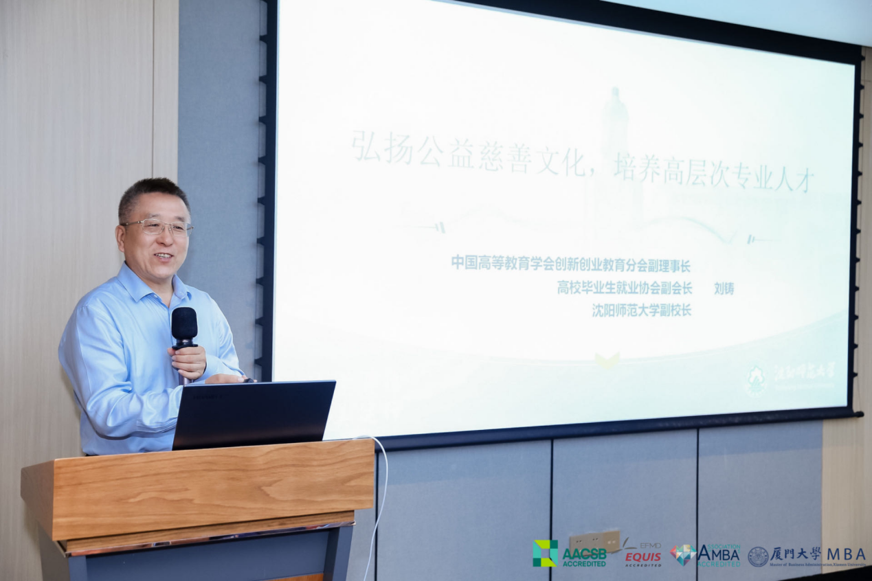 中国高等教育学会创新创业分会副理事长、沈阳师范大学副校长刘铸作了“弘扬公益慈善文化,培养高层次专业人才”的主旨报告分享。他强调树立共同富裕的理念对于促进社会创业的重要性。他指出,高校应该站在公益慈善的立场上,将公益、慈善和文化联合起来,并将其引入高校和课堂中,使学生们了解创业的初心和使命。他还提及了要推进公益慈善文化的基础,需要开设了公益慈善文化发展方向的研究生课程,探索和实践了高层次专业人才培养。最后,他呼吁凝聚资源力量,推进公益慈善生态体系的建设。
