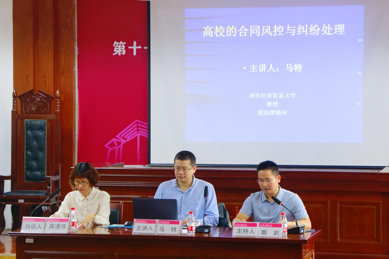 马特教授从实务的角度运用大量的案例分析并结合自身实践,详细介绍了合同的基本条款、高校合同风控与纠纷处理。他指出,高校应建立科学的合同审核与风险内控制度,以规范公章管理、明确合同管理范围、实施分类管理以及建立审计风暴与巡视制度,从而进一步提高高校风控合规水平,有效规避潜在风险。讲座前,学校发规处相关负责人针对学校合同管理遇到的问题和线上审批程序进行了专题说明和辅导。