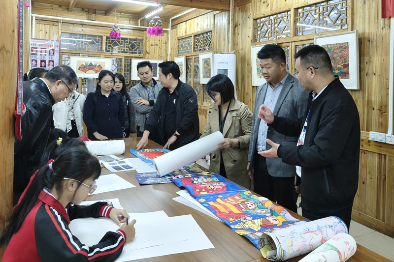 数学与统计学院党委一行参观了学校的民族团结进步文化长廊和展室,了解了学校“八个一”民族团结进步创建工作思路。在参观中,党员们走到画室观摩了小学生创作的农民画,聆听了侗族琵琶演奏的音乐。在农民画绘画现场,党员教师与作画的学生交流,了解了他们的创作思路。在民族团结进步展室中,与侗族文化相关的服饰、劳动工具和乐器深深吸引着党员们。学院党委负责人向三江侗族自治县民族实验学校校长杨文练介绍了学院“数学课栈”团队研发的课程资源和开展的各类特色公益活动,并就下一步开展民族团结进步共联共建进行交流。