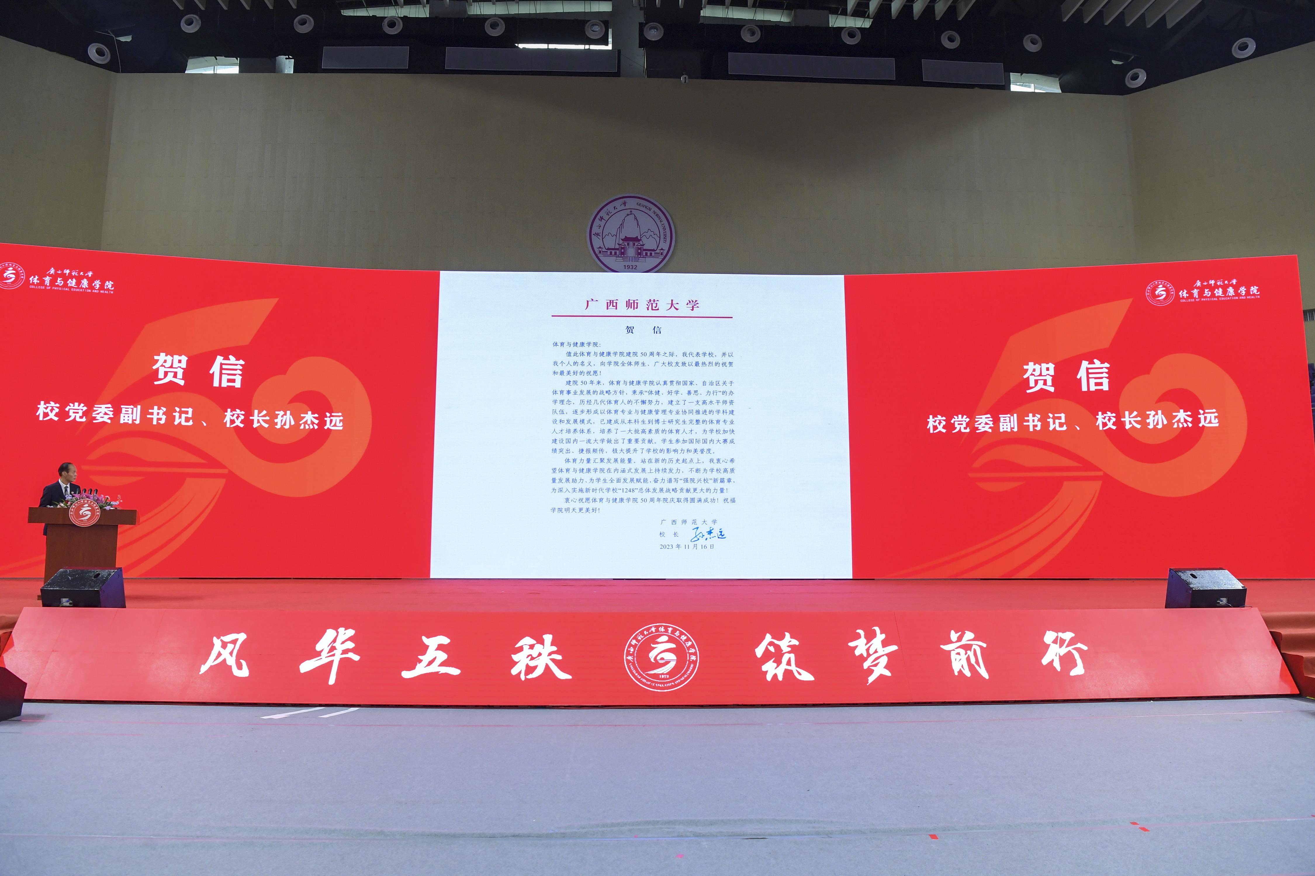 庆祝大会在全场高唱国歌中拉开序幕。广西师范大学党委副书记、校长孙杰远致贺信。贺信中,他代表学校并以个人名义,向学院全体师生、广大校友致以最热烈的祝贺和最美好的祝愿。他高度评价和充分肯定了体育与健康学院为学校加快建设国内一流大学做出的重要贡献,为广西和学校体育事业发展作出的突出贡献。他表示,希望体育与健康学院在内涵式发展上持续发力,不断为学校高质量发展助力、为学生全面发展赋能,奋力谱写“强院兴校”新篇章,为深入实施新时代学校“1248”总体发展战略贡献更大的力量。