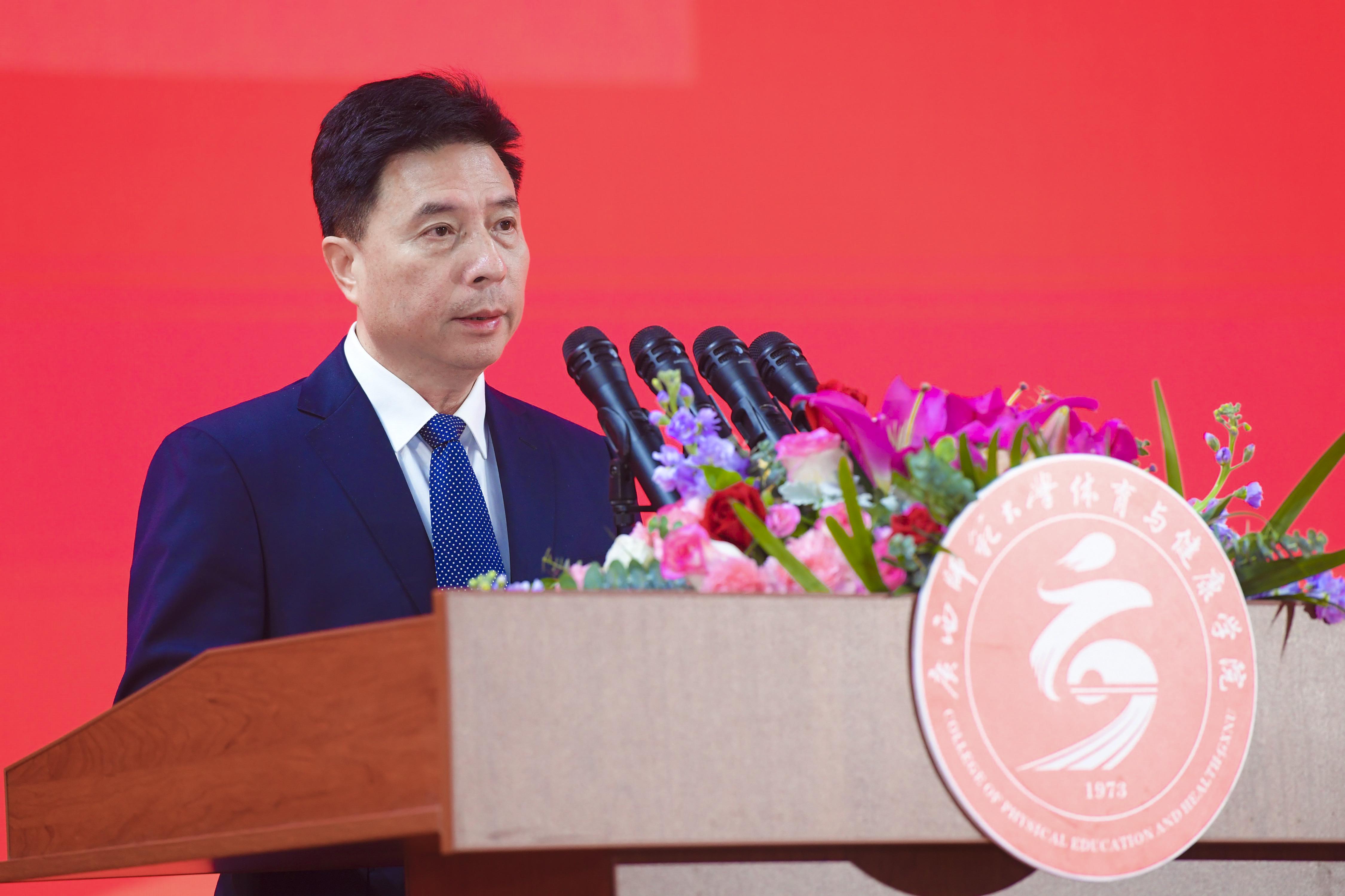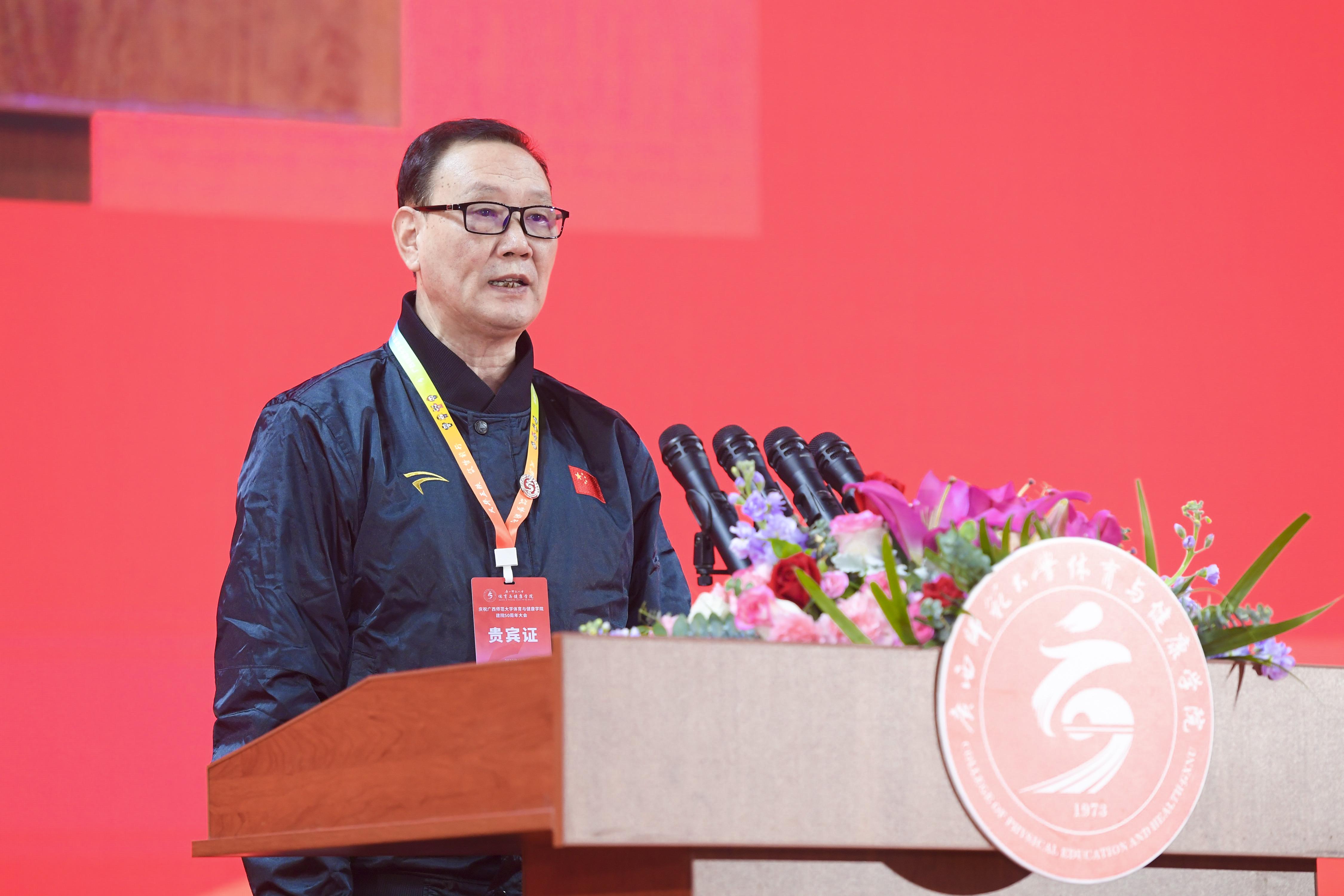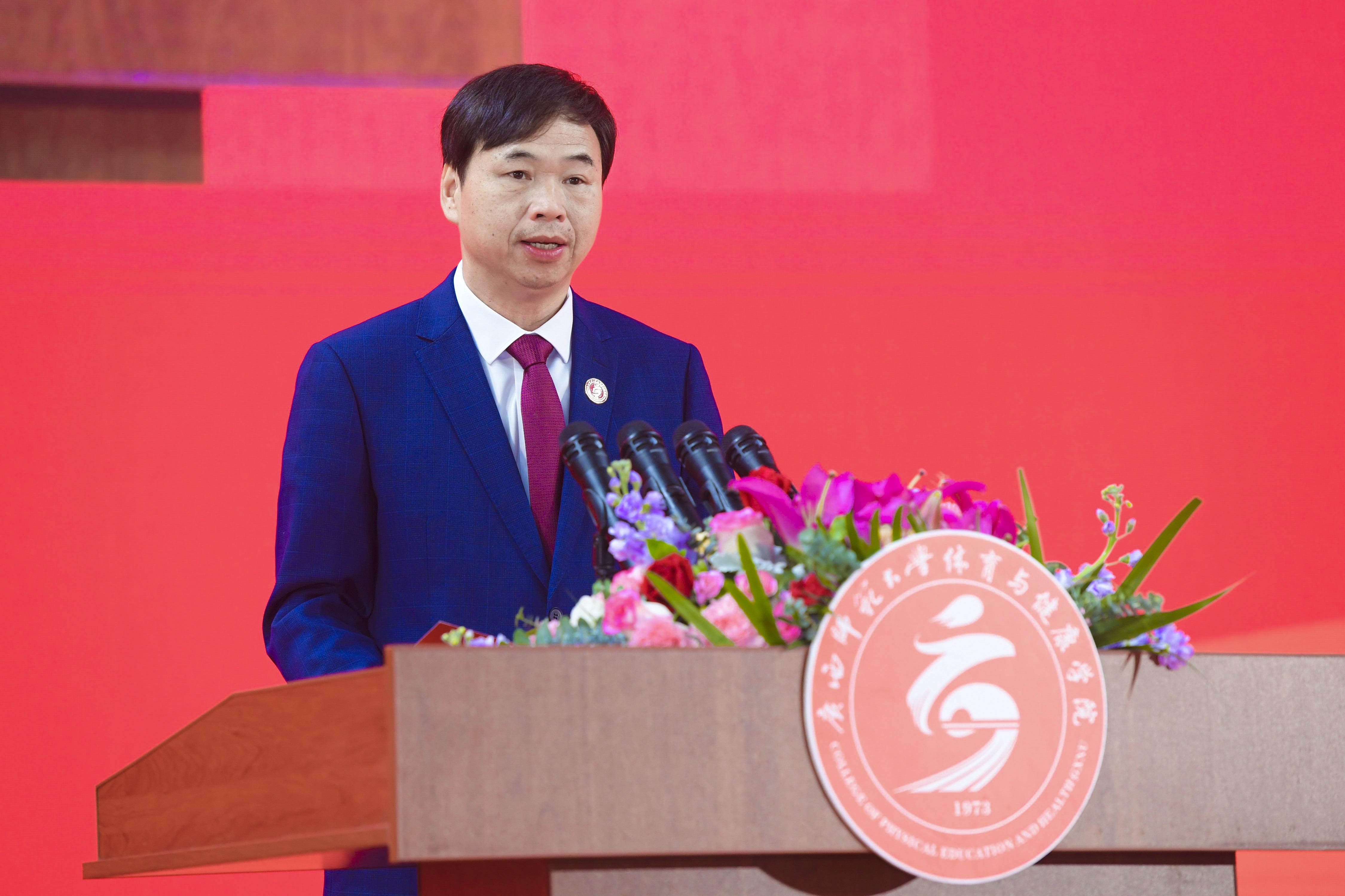 广西师范大学党委常委、副校长黄文韬致辞。他代表广西师范大学向参加庆祝活动的各位领导、来宾和校友们表示热烈的欢迎,向长期关心支持体育与健康学院事业发展的各级领导和社会各界朋友、校友们表示衷心的感谢,向体育与健康学院全体师生员工表示热烈的祝贺。他指出,希望学院继续深入学习贯彻党的二十大精神,全面贯彻党的教育方针,落实立德树人根本任务,坚持以高质量发展为目标,做优做强学科建设,为学校高质量发展提供强有力的支撑,为“强院兴校”贡献体育力量。