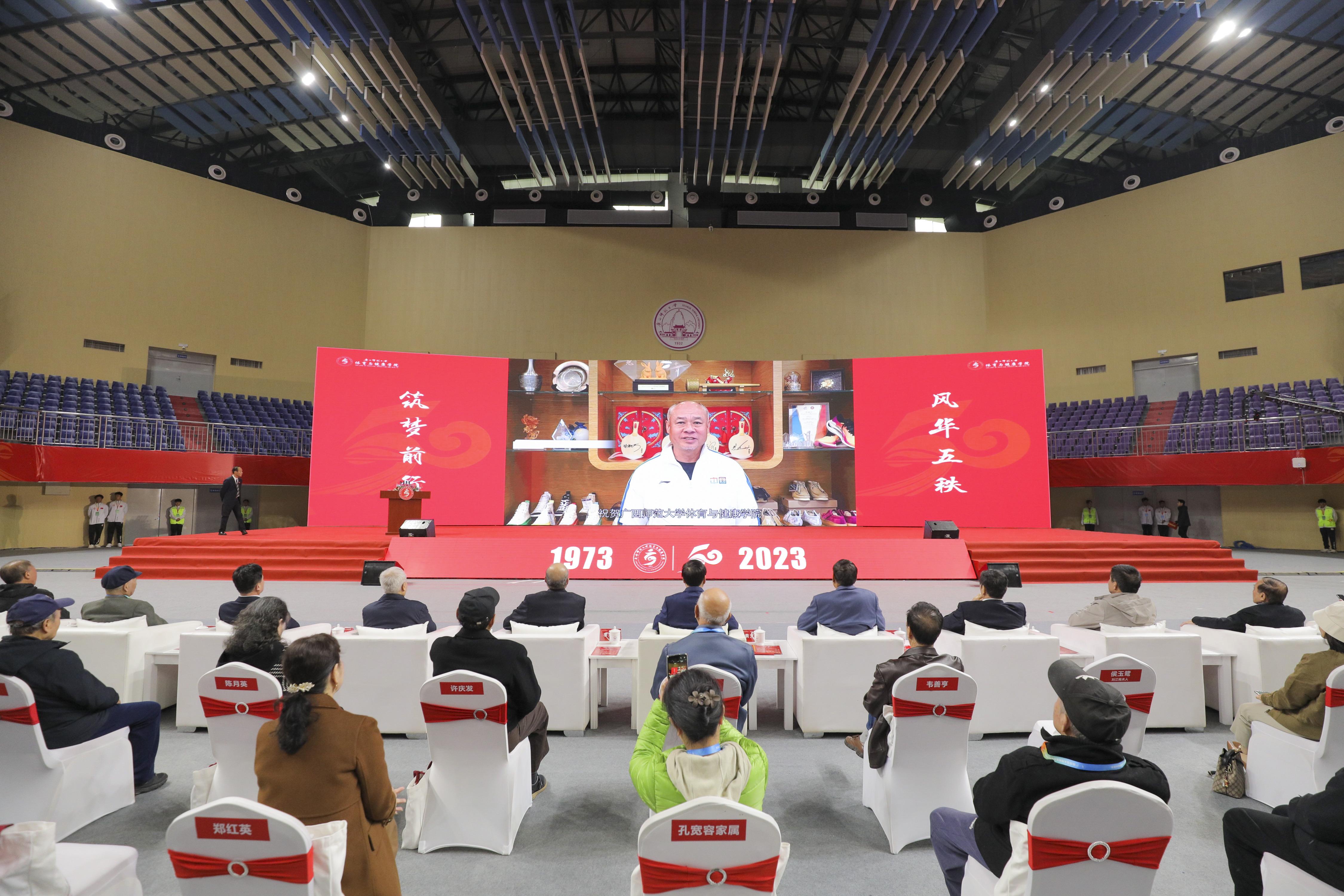 主会场内,“风华正茂五十年 筑梦前行三千里”“春秋五秩谱华章 体健同行向未来”“尊师体育遍八桂 授业健康五十年”的大幅红色标语展示着一代代体健人的初心使命;李宁等39位世界冠军校友的巨幅海报讲述着一代代体健人的坚守担当,现场气氛热烈,振奋人心。