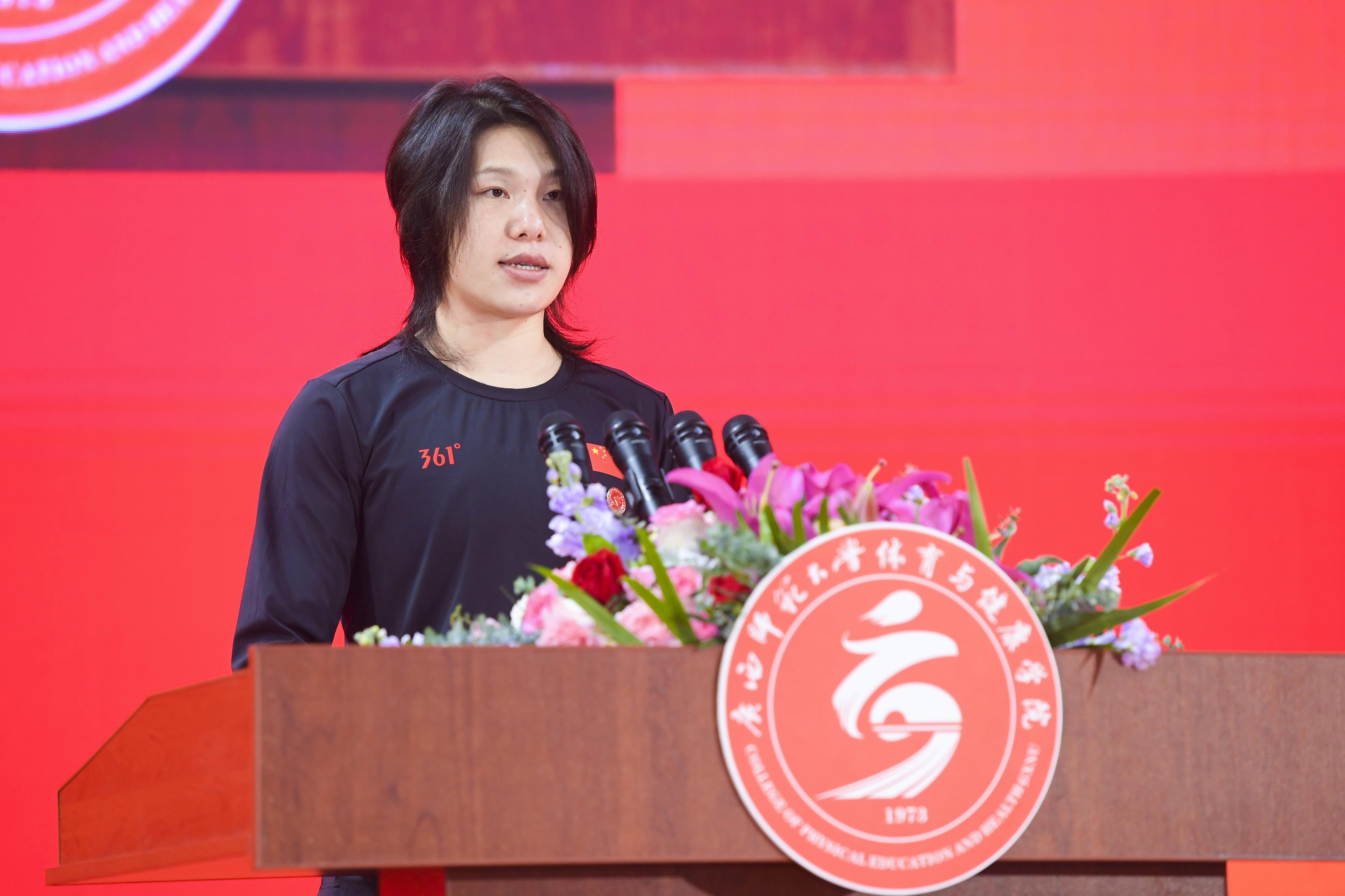 世界冠军校友代表、2016级运动训练专业毕业生农三凤发言。她表示成绩的取得离不开学校和学院的培养和支持,未来将继续发挥体育人的拼搏精神,坚守一个必胜的信念,哪怕疲惫不堪,也要咬紧牙关,绝不服输,为建设体育强国多作贡献。