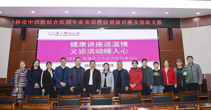 为进一步提高我校职工的健康意识,普及健康理念。11月30日下午,由校医院主办、离退休工作处协办的健康讲座义诊活动,在育才校区逸夫楼报告厅举行,活动邀请到了桂林医学院附属医院、桂林市中西医结合医院的4位专家。讲座由校医院主要负责人主持,我校部分离退休职工、师生代表、校医院全体医务人员、离退休工作处工作人员参加活动。
