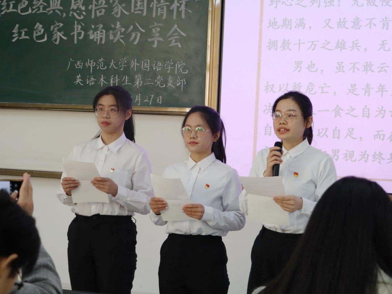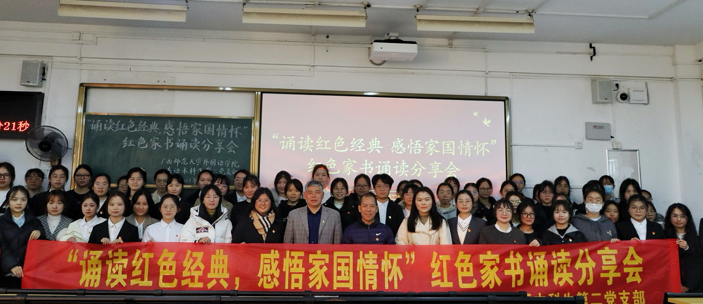 为传承红色基因,感悟信仰的力量,12月27日,外国语学院英语本科生第二党支部在雁山校区文科楼一区211教室举办了“诵读红色经典,感悟家国情怀”红色家书诵读分享会,校党委副书记、自治区纪委监委驻学校纪检监察组组长莫坷参加分享会并作指导讲话,外国语学院党委负责人、英语本科生第二党支部全体党员、入党积极分子70余人参加本次分享会。