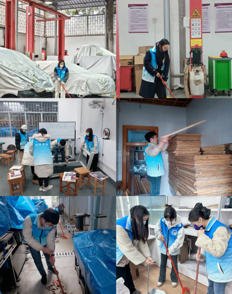 活动现场,大家手拿抹布、扫帚、垃圾袋等工具,分工明确,积极投入清扫工作,对学院各办公室、实训室、教室及学院周边区域进行集中清洁。他们有的拿起扫把清扫落叶和垃圾,有的拿起抹布擦拭门窗和桌椅,有的则负责搬运垃圾和整理物品,每个人都以饱满的热情和认真的态度投入到此次活动中,为共建美好校园贡献自己的一份力量。