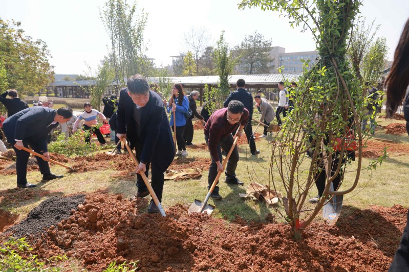 在观看了后勤服务集团校园绿化专业人员的现场示范后,每个植树小组便开始了种植工作。各组成员密切分工、团结协作,施肥拌土、扶树正苗、培土围堰、提水浇灌......一棵棵充满生机和希望的桃花树苗被全部栽种好。远远望去,嫩绿的树苗整齐有致,迎风挺立,形成了一道亮丽的风景线。植树过程中,贺祖斌、孙杰远等领导同志不时与师生们亲切交流,关心他们的工作、学习和生活情况,勉励大家要齐心协力,共同建设生态文明校园,奋力推进国内一流大学建设、助力教育强区。