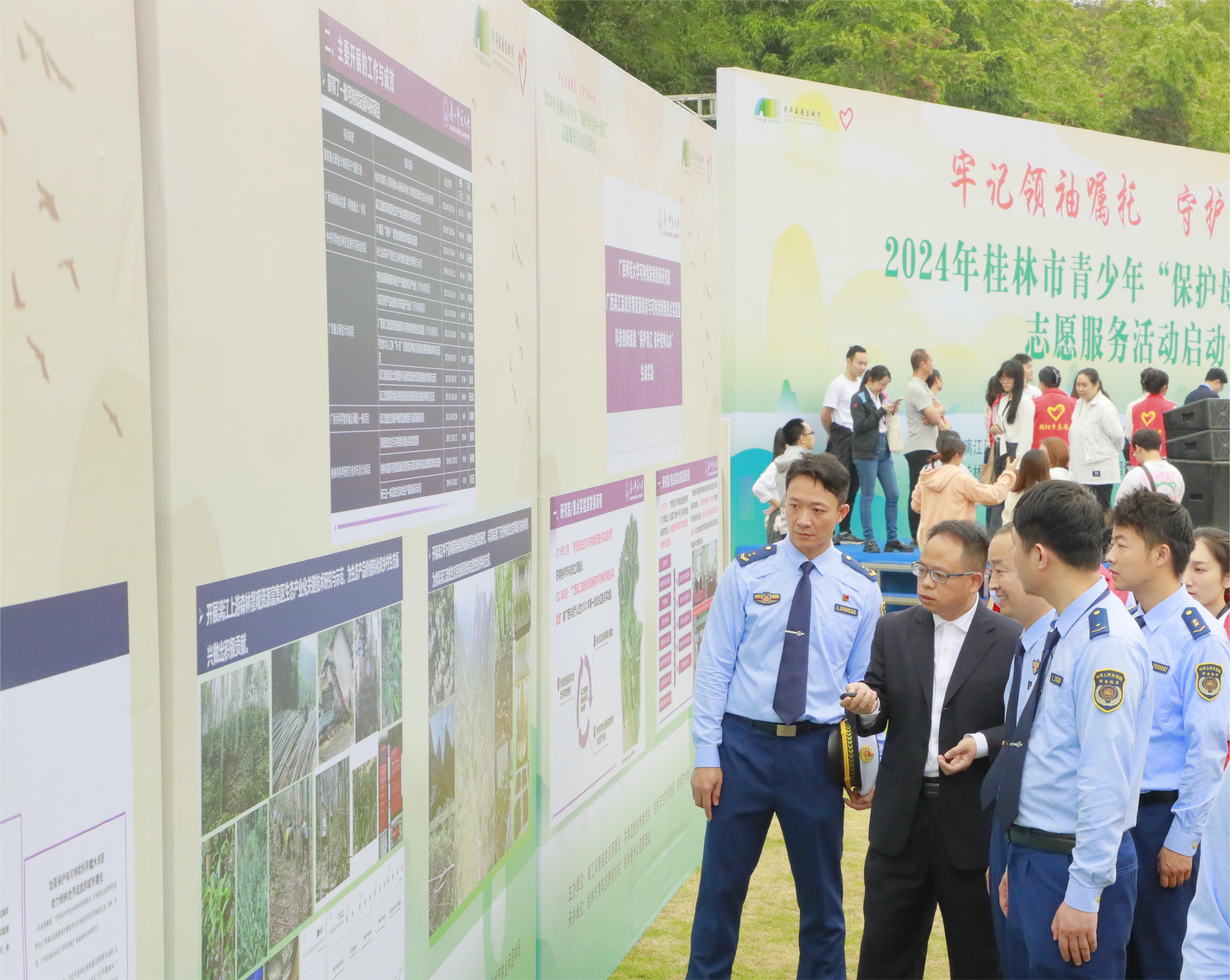 4月25日,2024年桂林市青少年“保护母亲河——漓江”志愿服务活动在訾洲公园启动。此次活动以“牢记领袖嘱托 守护桂林山水”为主题,全面学习贯彻党的二十大精神,深入贯彻落实习近平总书记对广西重大方略要求和对桂林的重要指示精神,全面宣传展示桂林市深入践行习近平生态文明思想,不断增强公众自觉保护漓江意识、全力保护漓江、保护桂林山水的思想自觉和行动自觉。市人大常委会副主任、漓江风景名胜区党工委副书记唐修璇讲话并宣布活动启动。学校可持续发展创新研究院(以下简称“研究院”)和广西漓江流域景观资源保育与可持续利用重点实验室(以下简称“重点实验室”)受邀在此次活动中展示了近年来在保护漓江、保护桂林山水的代表性科研成果。