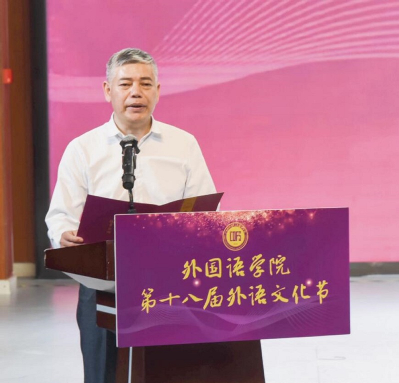 校党委副书记莫坷在开幕式上致辞时表示,语言是人文交流、文明互鉴的桥梁,学习外语不仅是掌握技能,更是了解世界、传播中华优秀传统文化的重要途径。他希望广大外语学子积极参与各项活动,通过实践锻炼自己的专业技能,拓展国际视野,增强文化自信,鼓励学生们在融合中外文化、贯通东西的过程中不断超越自我,追求卓越。最后,他高度肯定了外语文化节作为外国语学院特色文化名片的重要地位并预祝本届外语文化节圆满成功,希望外语文化节越办越好,成为学校校园文化活动的精品特色,为学校加快建设国内一流大学、助力教育强国、文化强国贡献力量。
