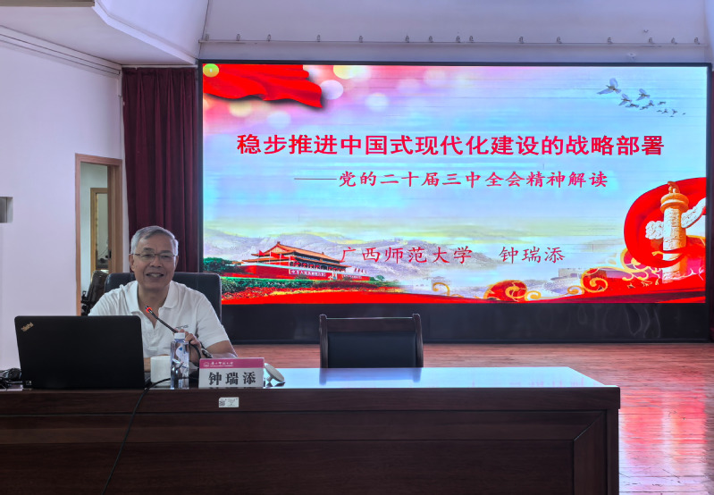 专题学习会邀请到我校原副校长钟瑞添教授给大家做专题辅导报告。钟瑞添教授的专题报告围绕《稳步推进中国式现代化建设的战略部署——党的二十届三中全会精神解读》,从“充分认识党的二十届三中全会里程碑意义”“新一轮全面深化改革的总目标、路线图和重大原则”“以经济体制改革为牵引的全方位改革的精准部署”“凝心聚力奋力谱写中国式现代化广西篇章”等四个方面进行深入浅出地讲解,报告主题鲜明、站位高远,内容丰富、重点突出,条理清晰、通俗易懂,既有政治高度、理论深度,又有联系实际的体会思考,令人受益匪浅。
