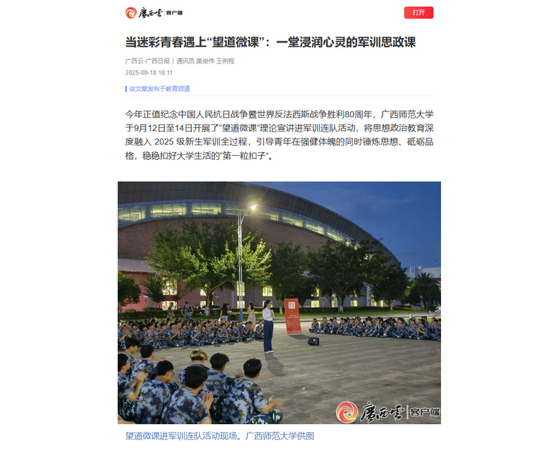 9月18日,【广西云】关注报道我校于9月12日至14日创新开展的“望道微课”理论宣讲进军训连队活动,这次活动将思想政治教育深度融入2025级新生军训全过程。此次宣讲团由研究生和本科生组成,围绕“成长篇”和“爱国主义教育篇”两大主题,以朋辈身份深入各连队,通过分享自身学术实践经历和抗战英雄事迹,引导新生在强健体魄的同时坚定理想信念、砥砺家国情怀。活动现场,新生们认真聆听、积极互动,在回望历史中思考青春责任与时代使命。此次活动是学校创新入学教育模式的重要实践,通过视频录制、现场采访和问卷反馈等方式不断优化内容与形式,让有温度的思政教育有效浸润青年心灵,为新生扣好大学生活的“第一粒扣子”。