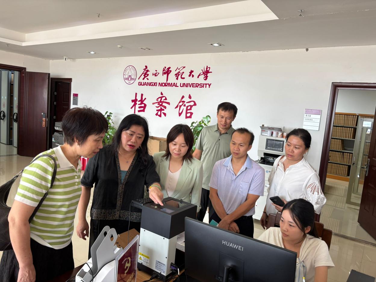 座谈会上,档案馆主要负责人对调研团队的到来表示热烈欢迎,并全面介绍了学校档案馆人员构成及馆藏情况。相关负责人介绍了学生档案室管理情况。学校党委宣传部文明办相关负责人就校史馆的校史编研、文化宣传等方面作交流发言。双方就档案收集、整理、保管、利用及信息化建设等方面进行深入交流,进一步促进了档案管理经验的共享。广西中医药大学档案馆主要负责人表示,广西师范大学各项档案和校史工作建设成果显著,值得学习与借鉴,对推动广西中医药大学档案馆高质量建设与发展具有极高的学习价值。