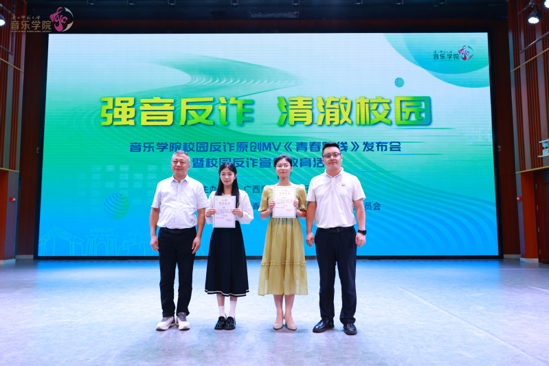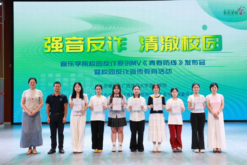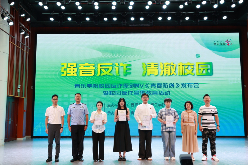 为深入贯彻落实全民反诈工作要求,切实强化广大师生防范电信网络诈骗的意识和能力,营造安全、稳定、和谐的校园环境,9月29日晚,音乐学院在雁山校区音乐楼B307综合厅举行“强音反诈 清澈校园”——校园反诈原创MV《青春防线》发布会暨反诈宣传教育活动。人民网广西频道相关负责人、桂林市公安局雁山分局刑侦三大队负责人李灵希及校学工部(处)、研工部、校团委、保卫处、音乐学院等相关单位负责人出席活动,音乐学院500余名师生代表共同参与。