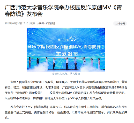近日,人民网关注报道我校音乐学院在雁山校区成功举办“强音反诈 清澈校园”——校园反诈原创MV《青春防线》发布会暨反诈宣传教育活动。活动发布了由学院师生共同创作的原创反诈MV,并组织了反诈微视频展评、专题宣讲和集体签名等环节,以艺术形式有效提升了师生的防诈意识。作为活动主办方,我校充分发挥音乐学院的专业优势,将艺术创作与安全教育深度融合,通过创新宣传形式筑牢校园安全防线。此次活动展现了我校以专业特色服务校园安全建设的积极探索,为构建“全民反诈”格局贡献了高校力量。
