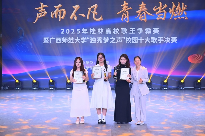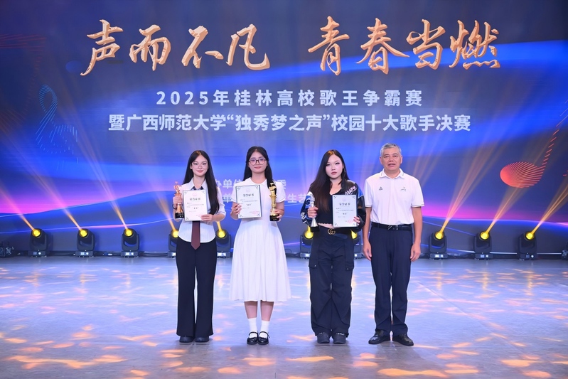 最终荣誉揭晓时刻,全场目光聚焦舞台:我校音乐学院姚春彤凭借稳定的现场发挥与过硬的专业功底,一举拿下校园十大歌手冠军与桂林高校“歌王”冠军荣誉;韦子欢以深情唱腔获校园十大歌手亚军,韦丁尹凭灵动演绎摘得季军,秦世杰、蒙炫鹏、聂曦雅、胡艺纯、蔡彬本、白鑫源、韦其才7位同学一并获得校园十大歌手称号;桂林理工大学陈汝琳、桂林学院黎文幸分别获2025年桂林高校歌王争霸赛亚军和季军。