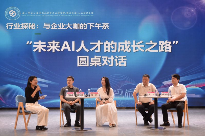 活动最后还设置了圆桌对话环节,以“未来AI人才的成长之路”为主题,四位嘉宾围绕“企业招聘最看重的本科生素养”“实习与项目实践建议”“广西数字经济产业发展机遇”等议题展开深入探讨。其中,奇安信科技集团股份有限公司广西分区教育行业总监林国钧结合自身经历与学生互动,为同学们指明了成长方向,增强了学习与就业的信心。