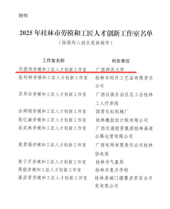 【喜报】广西师范大学邓荫伟劳模和工匠人才创新工作室被认定为2025年桂林市劳模和工匠人才创新工作室